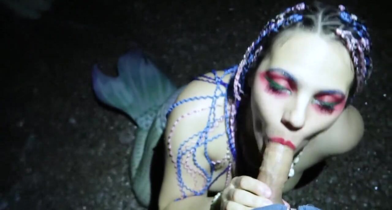 Косплей русалки на пляже оборачивается для девицы с большой грудью слюнявым минетом в общественном месте. Она опускается на колени прямо в своем наряде, обхватывая толстый болт губами крупным планом от первого лица. Шум волн заглушает звуки жадных заглотов, пока сучка старательно работает языком по всей длине агрегата. В финале этого публичного разврата русалка получает свою награду: парень заливает её лицо и грудь густой порцией горячего семени, которое блестит на солнце в свете хэллоуинской луны.